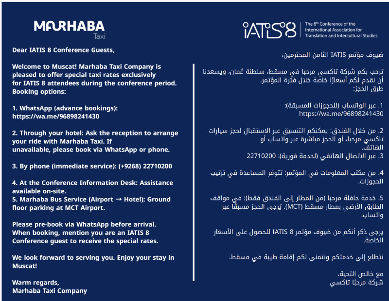 Bank Muscat has a branch at the Sultan Qaboos University campus. Bank Muscat, NBO, and Bank Dhofar ATMs are also available on campus. Do not hesitate to ask the organizers.
